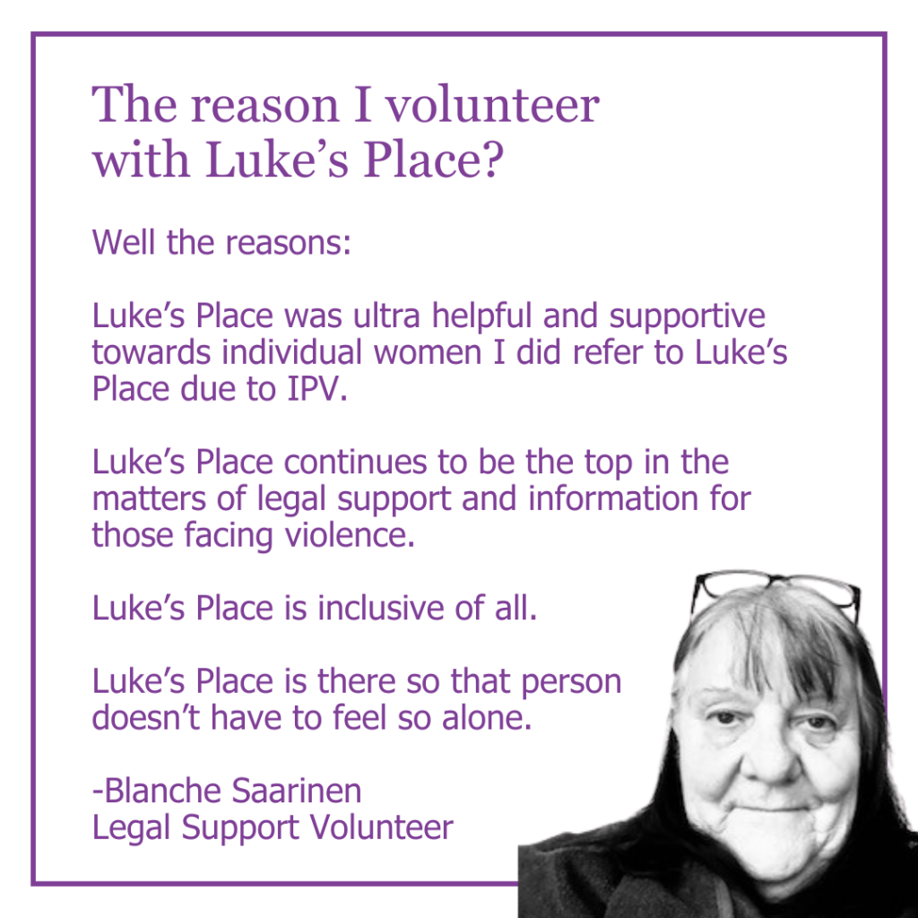At Luke’s Place, we currently have four key areas where volunteers play a critical role in our work: our board of directors, our pro bono lawyers in our legal clinic, our legal support volunteers for court accompaniments with women and our law and social work students who assist our organization in a number of different ways.